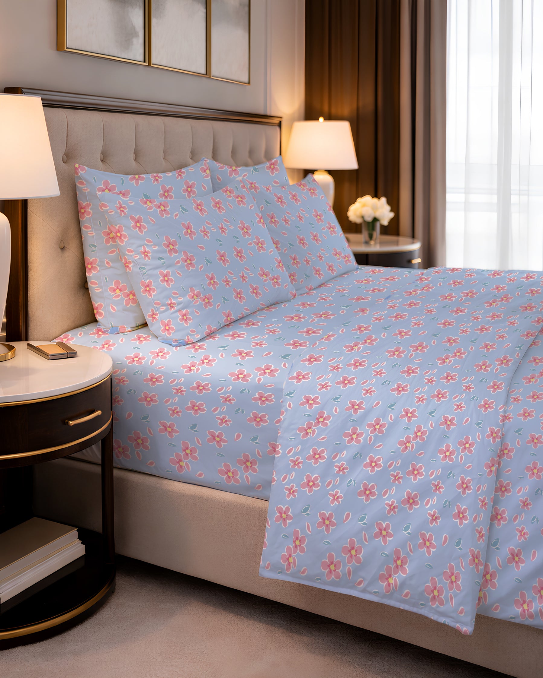 This design features graceful flourished flowers placed with thoughtful spacing, giving the pattern a breathing, airy feel. The well-separated blooms create a sense of calm and subtle sophistication, perfect for a bedroom that embraces refined simplicity